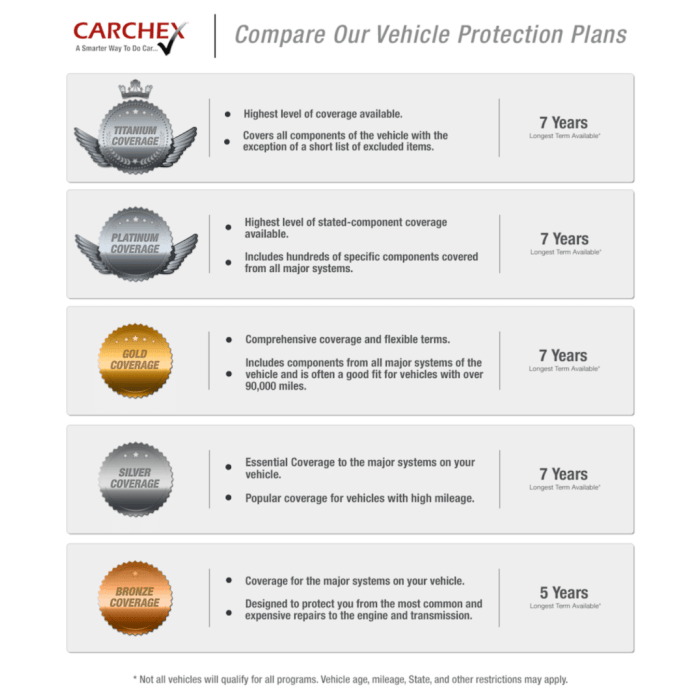 - CARCHEX: CARCHEX provides similar coverage options, such as the Titanium, Platinum, Gold, and Silver plans. These plans also vary in coverage levels, with some focusing on essential components like the powertrain and others offering more extensive protection.